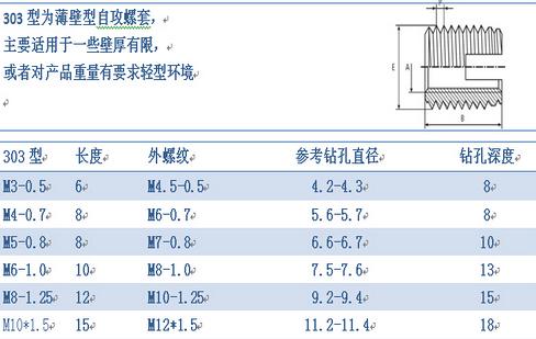 薄壁型合肥自攻螺套外观上看主要有两种区分,一种是一端开槽型的,另一种是一端三圆孔型的,其中开圆孔型的又分为307型和308型两种,307型和308型外观主要区别就是同一直径下,长度和外径大小有所区分。以上各种型式螺套均具有自行攻牙功能。